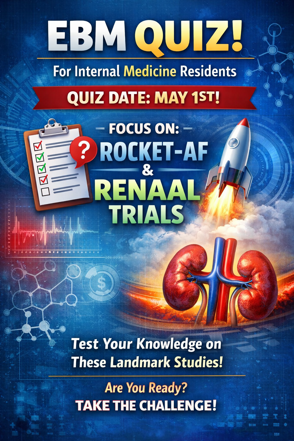 For the next part of the asynchronous Evidenced-Based Medicine Curriculum, we are asking residents to review the ROCKET-AF and RENAAL trials. Like other trials we’ve reviewed, there will be a brief quiz on the articles during our next Housestaff Meeting (tentatively May 1st)! Please be sure to visit EBMHits.org to utilize the abridged presentations and quiz questions ahead of time.